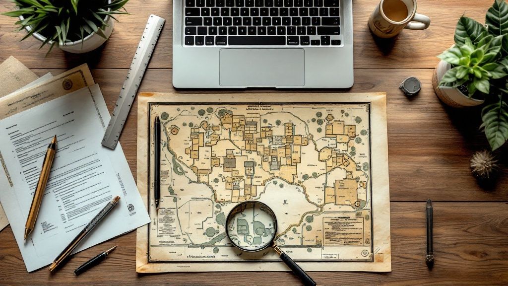 Before you’d ever buy a used car, you’d pull its vehicle history report to check for accidents or liens, right? A land title search is exactly that, but for real estate—where the stakes are infinitely higher. It's a meticulous investigation into a property's paper trail to confirm the seller is the genuine owner and to identify any skeletons in the closet that could threaten your investment.